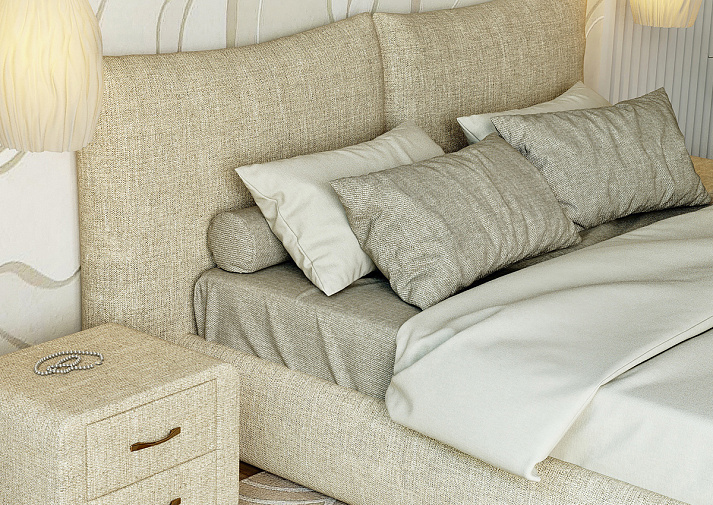 В первую очередь взгляд приковывает изголовье с округлыми формами, выполненное в виде двух объёмных подушек. Его плавные контуры: