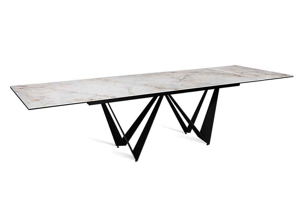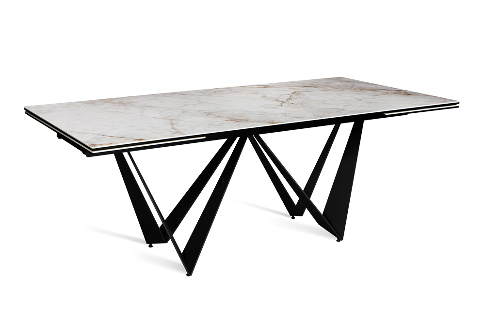 Стол PONTE 200 CALIFORNIA CER на треугольных опорах притягивает футуристической нереальностью и кажется парящим в воздухе. Однако нержавеющая сталь, из которой выполнен каркас, надежна и не поддается коррозии, а конструкция устойчива как в сложенном, так и в разложенном виде. Цвет опор гармонирует со столешницей из прочной глянцевой керамики испанского производства, оттенки которой имитируют мрамор светлого песочного цвета. Динамичная модель подходит для просторной кухни, гостиной или студии в монохромной или контрастной цветовой гамме.